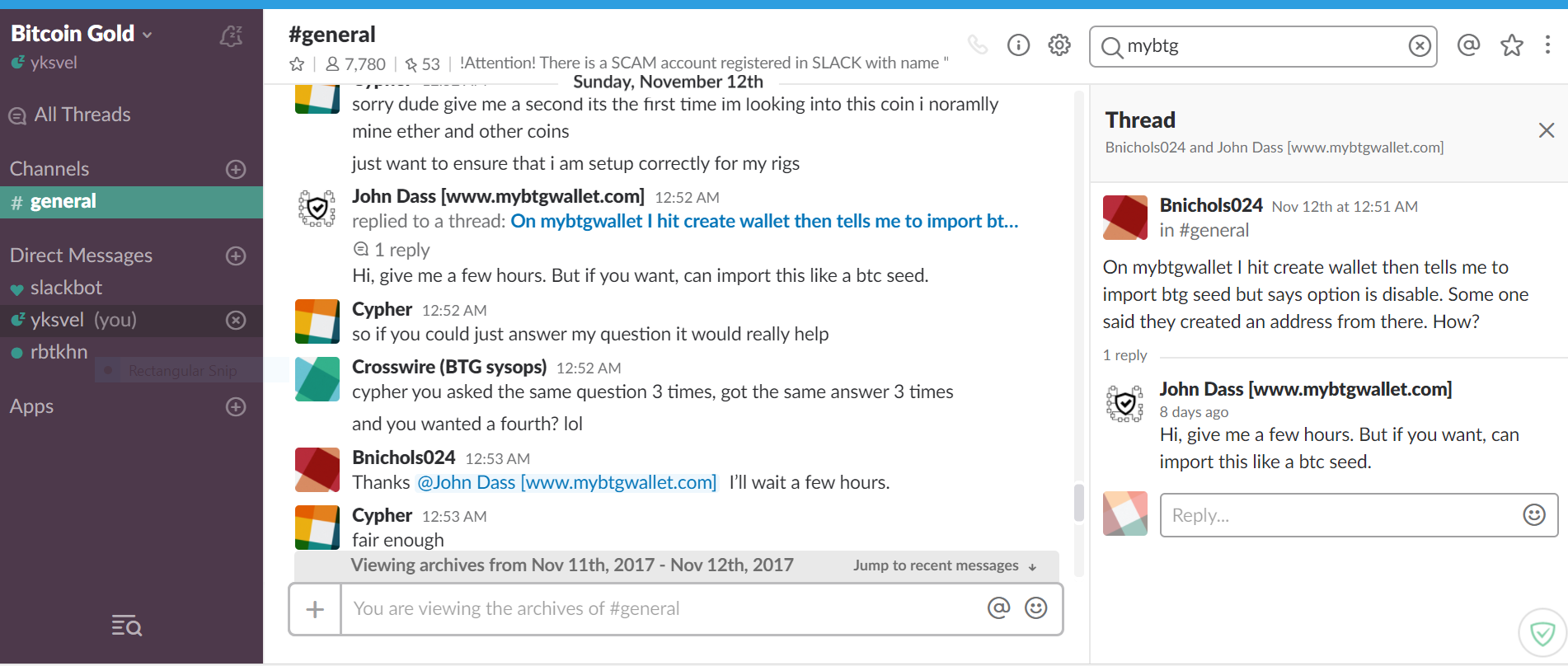 It is known that the Bitcoin Gold team hired a third party to develop the ecosystem. It was John Dass, who was dubbed DEVELOPER in the official Bitcoin Gold slack channel. He openly called users to chose the wallet he had developed. Notably, the BTG team confirmed their cooperation with John Dass, and endorsed the usage of Mybtgwallet.