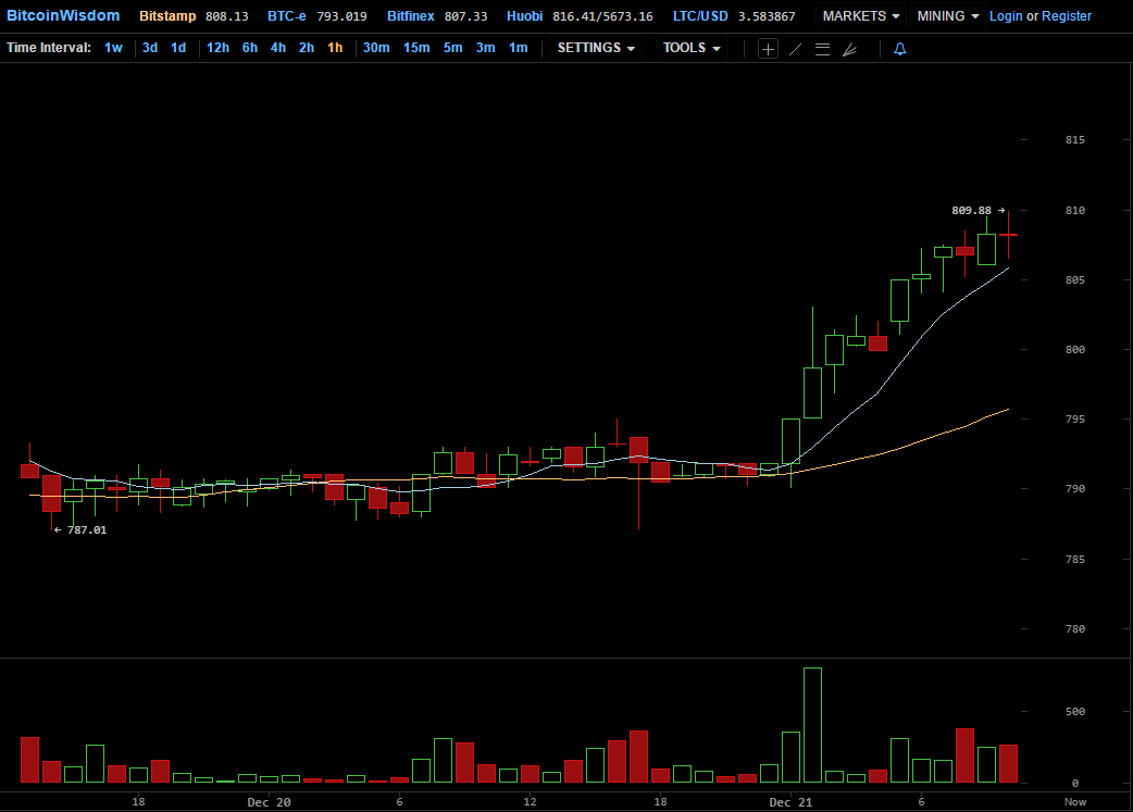 Overnight into Wednesday, December 21, bitcoin price has reached its maximum since February 2014 following the new spate of activity on the side of Chinese investors, effectively surpassing $800.