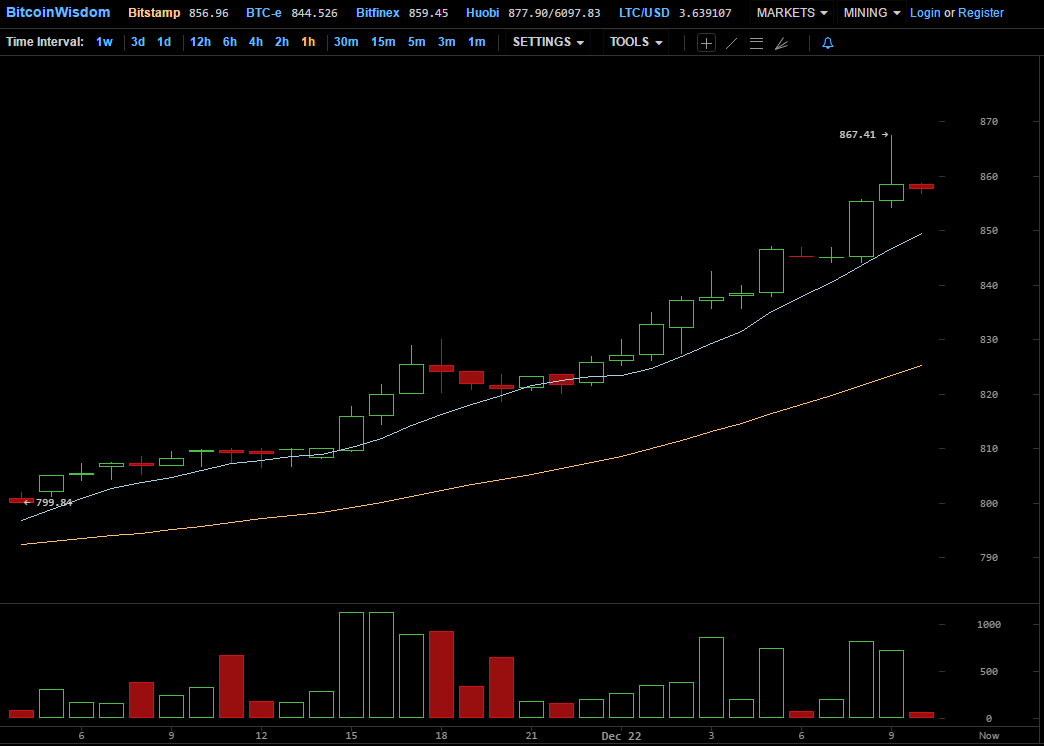 Bitcoin has surpassed the $850 mark, and by 8.00 UTC its average weighted exchange rate has comprised $863.52. At Bitstamp, Bitcoin price is currently $858, while Bitfinex offers $859, and BTC-e $844.