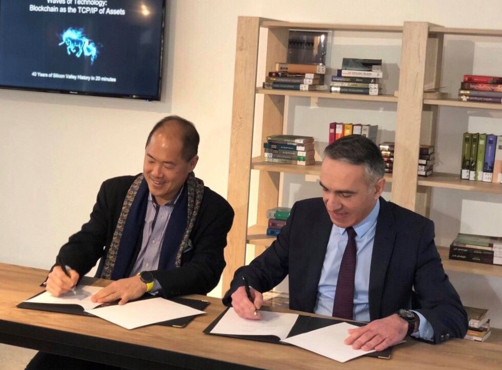 Emercoin investor and advisor, venture capitalist Bill Tai (Left) and Business & Technology University Tbilisi Rector, now Minister of Education, Science, Culture and Sports of Georgia Mikheil Batiashvili (Right), signing MOU