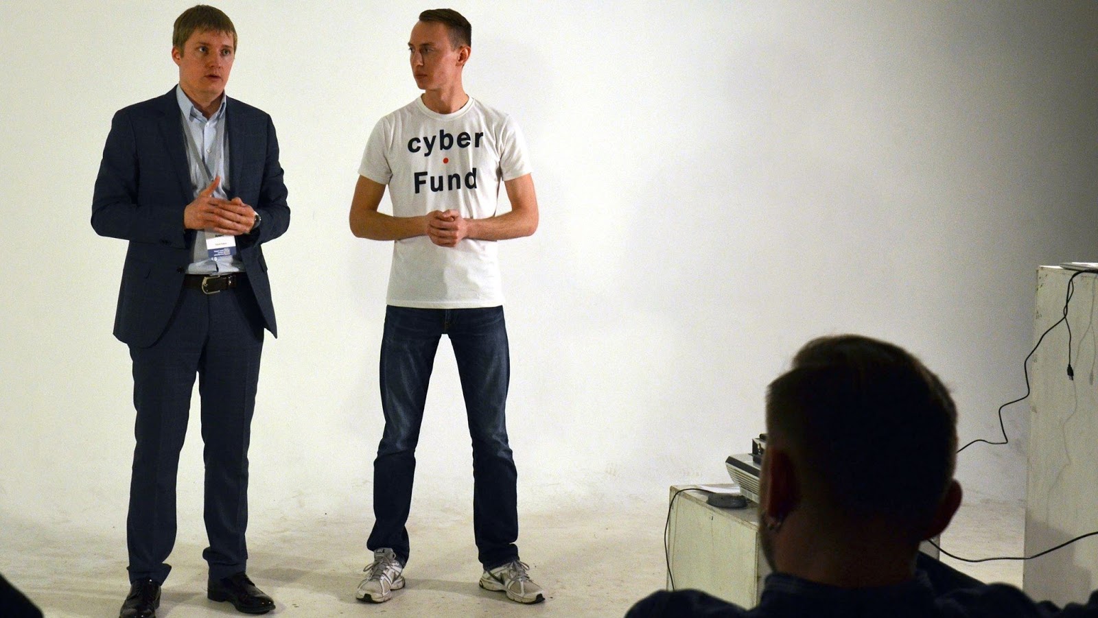 Alex Fork, founder of Russian fintech accelerator Future Fintech, making important announcement with Valery Litvin
