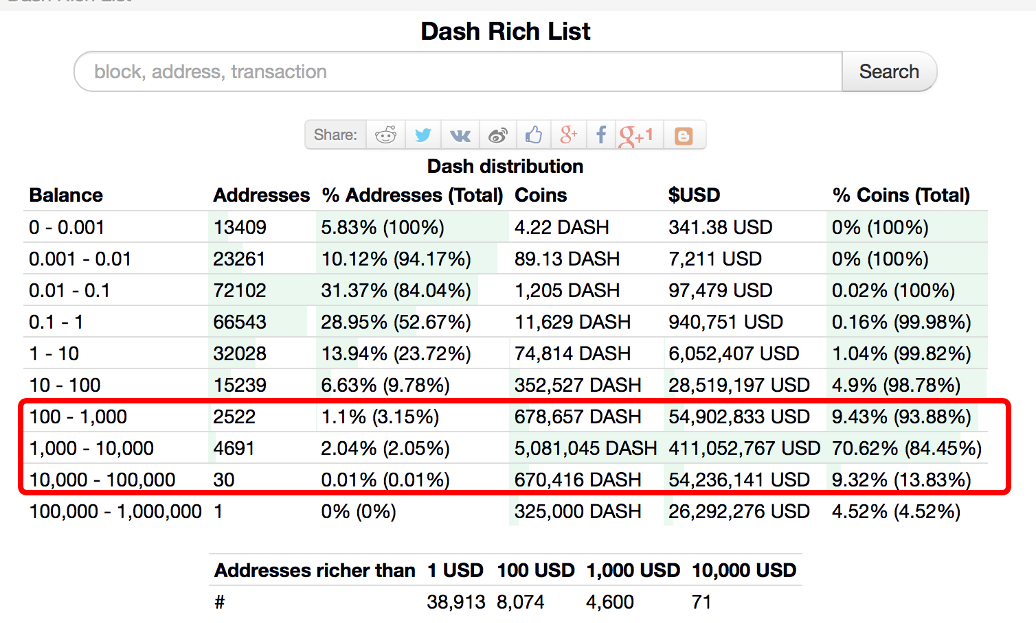 Over 70 per cent of coins are located in just 2 per cent of wallets, with 20 per cent more in 1 per cent of wallets. This actually means that just 3 per cent of Dash owners control more than 90 per cent of coins. This distribution is way to uniform and unnatural, and opens a highway for price manipulations.
