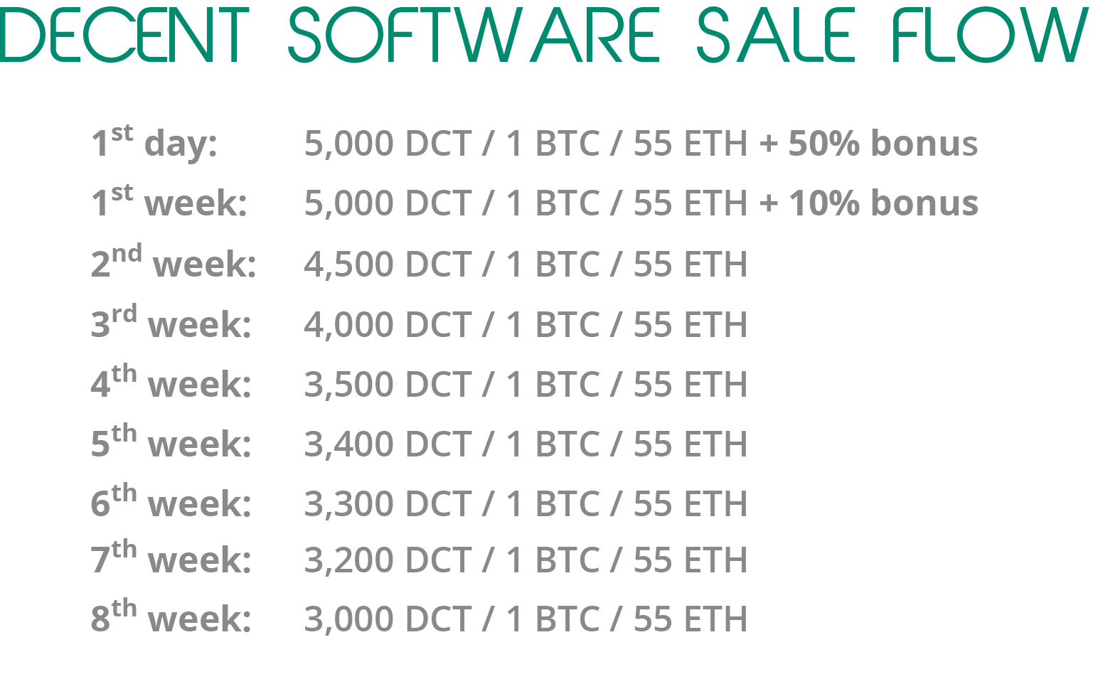 The initial value of DCT will increase simultaneously with the Software Sale progress. Which means the early participants get more for smaller value and apply for higher bonuses.