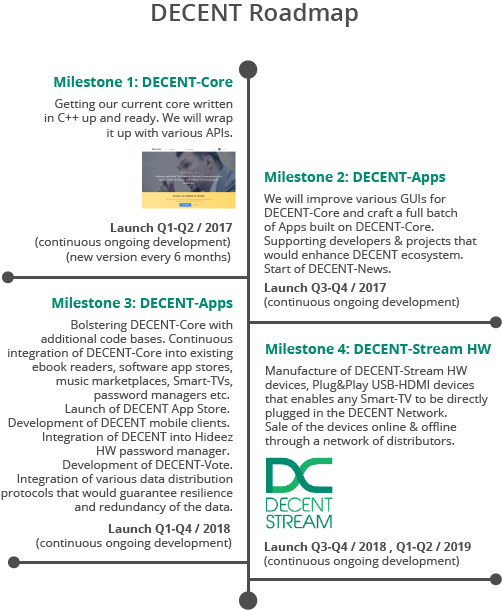 DECENT Network is currently in the Pre-Alpha stage and is set to launch in the beginning of 2017. The ICO will last for the next 8 weeks. You can also check out the Roadmap, which details the plans regarding the development of the DECENT Platform.