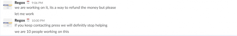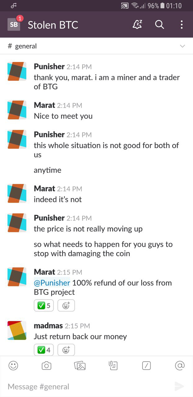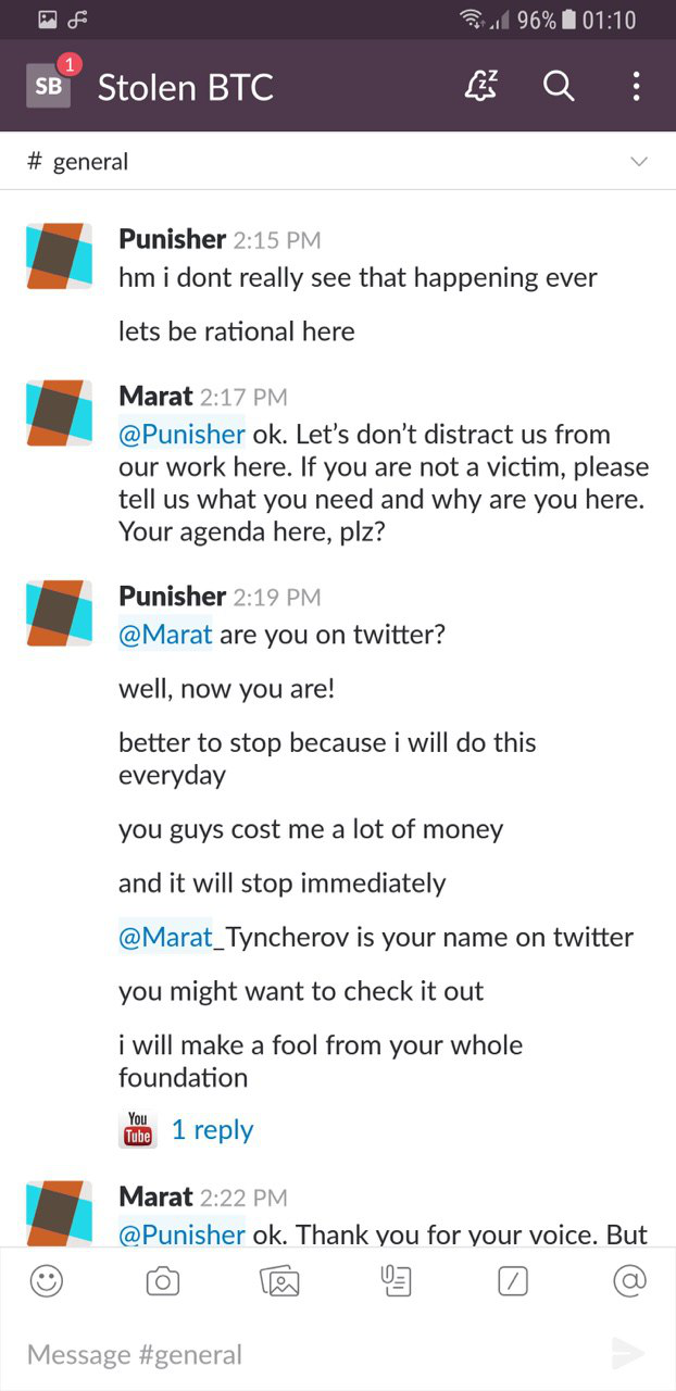 Furthermore, some unknown individuals joined the official victims’ Slack-channel to force the group to cease pressure on BTG project. They also threatened the victims.