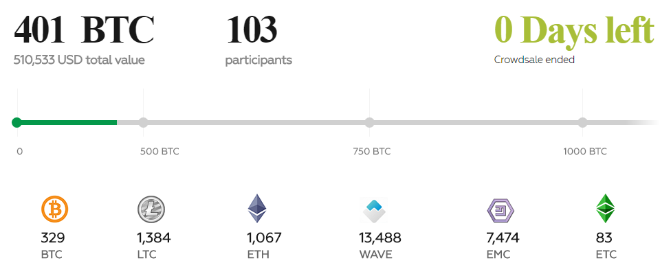 The crowdsale was announced back in March and kicked off on April 1st, raising 329 BTC, 1,384 LTC, 1,067 ETH, 13,488 WAVES, 7,474 EMC, and 83 ETC.